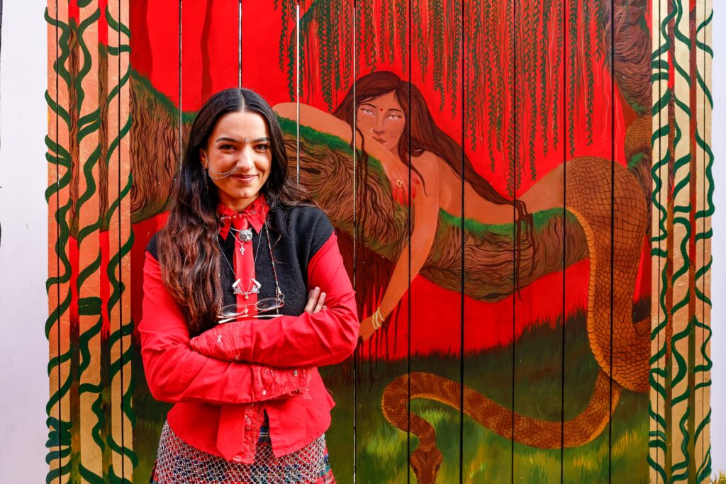 Bex Masters, a gilder and oil painter, has created Kundalini, a mural exploring reflection and renewal through ideas of feminine energy and transformation. Bex said: “Inspired by my multicultural upbringing and heritage, this mural explores the concept of a Pleasure Garden through the eyes and hands of a person of colour.”