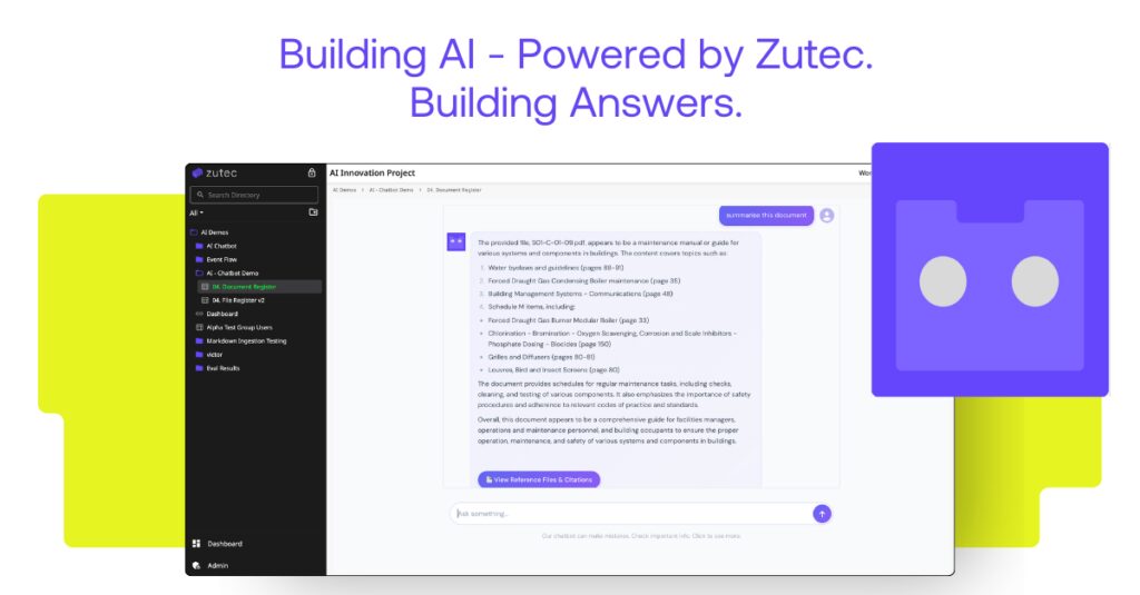 This makes Building AI – Powered by Zutec particularly well suited to compliance-critical use cases, including asset and maintenance queries, regulatory and safety information retrieval, handover validation, and portfolio-wide insight across buildings. It also ensures information is accessible and can be updated as part of a golden thread of information, for Higher Risk Residential Buildings (HRRBs).